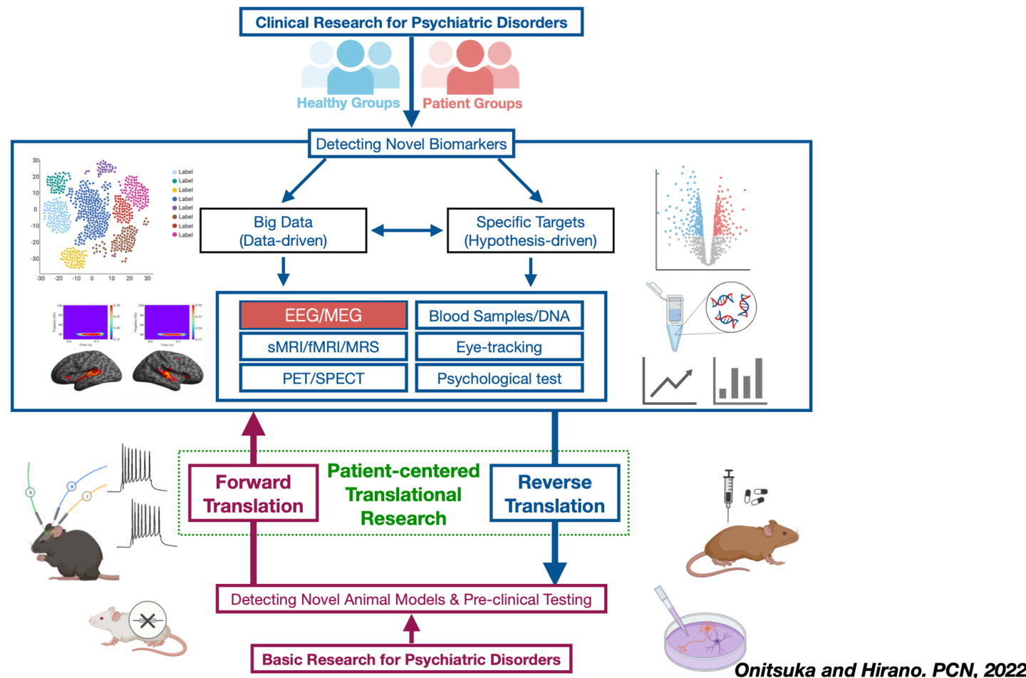 Clinical research needs to detect novel biomarkers, by focusing on specific targets (hypothesis-driven) or using big data (data-driven), that are translatable to basic research. Basic research needs to detect novel animal models that would be useful for preclinical testing. These clinical and basic studies need to be performed bidirectionally through forward translation and reverse translation to achieve patient-centered translational therapeutic research. Neurophysiological studies using electroencephalography (EEG) play a vital role in bidirectional translational research because EEG data can be obtained in both humans and animals.